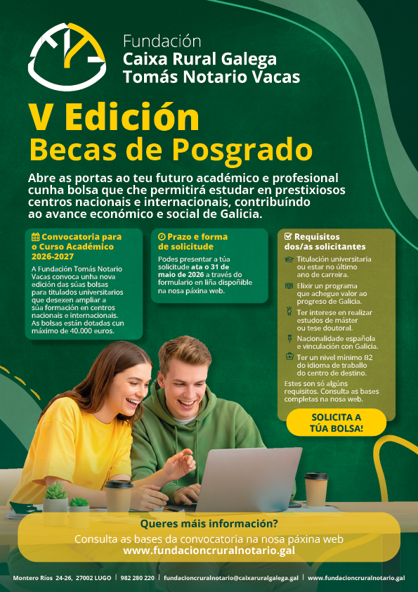 Concesión de bolsas para a realización de estudos presenciais dirixidos á obtención dun título oficial de máster ou tese doutoral nacional ou estranxeiro en calquera disciplina que poida reverter na mellora das actividades produtivas e, en xeral, ao progreso económico, social e cultural de Galicia, con atención especial a aquelas relacionadas co sector agro alimentario e forestal, durante o curso académico 2025-2026.